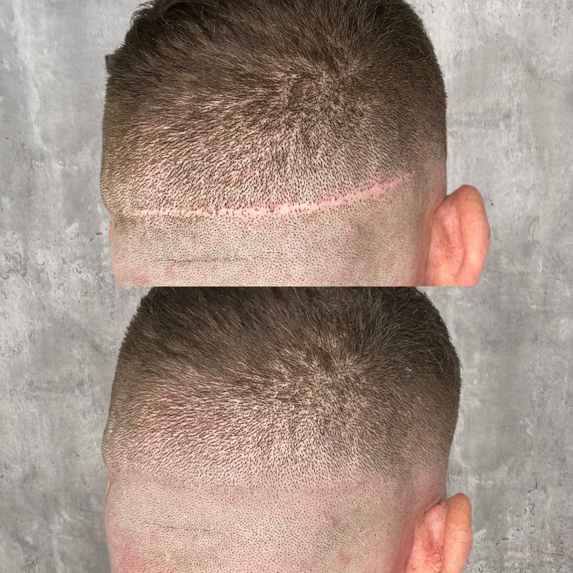 Hair transplant procedures like FUT (Follicular Unit Transplantation) and FUE (Follicular Unit Extraction) can leave noticeable scarring on the back of the head. These scars are typically hidden under hair, but they may still be visible to others. Some clients are left with white, raised, or hyper-visible scars that can make hair restoration feel like a setback.